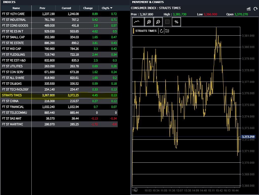 The Business Times- "... The Straits Times Index (STI) finished 4.45 points or 0.1 per cent higher at 3,372.25... Singapore real estate investment trusts (Reits) continued to be in fashion despite "expensive" valuations. Investor interest was still high, thanks to dovish central banks and in the case of the local market, the prospect that Reits could see their current leverage limit of 45 per cent raised in future. The iEdge S-Reit 20 Index added 0.5 per cent.